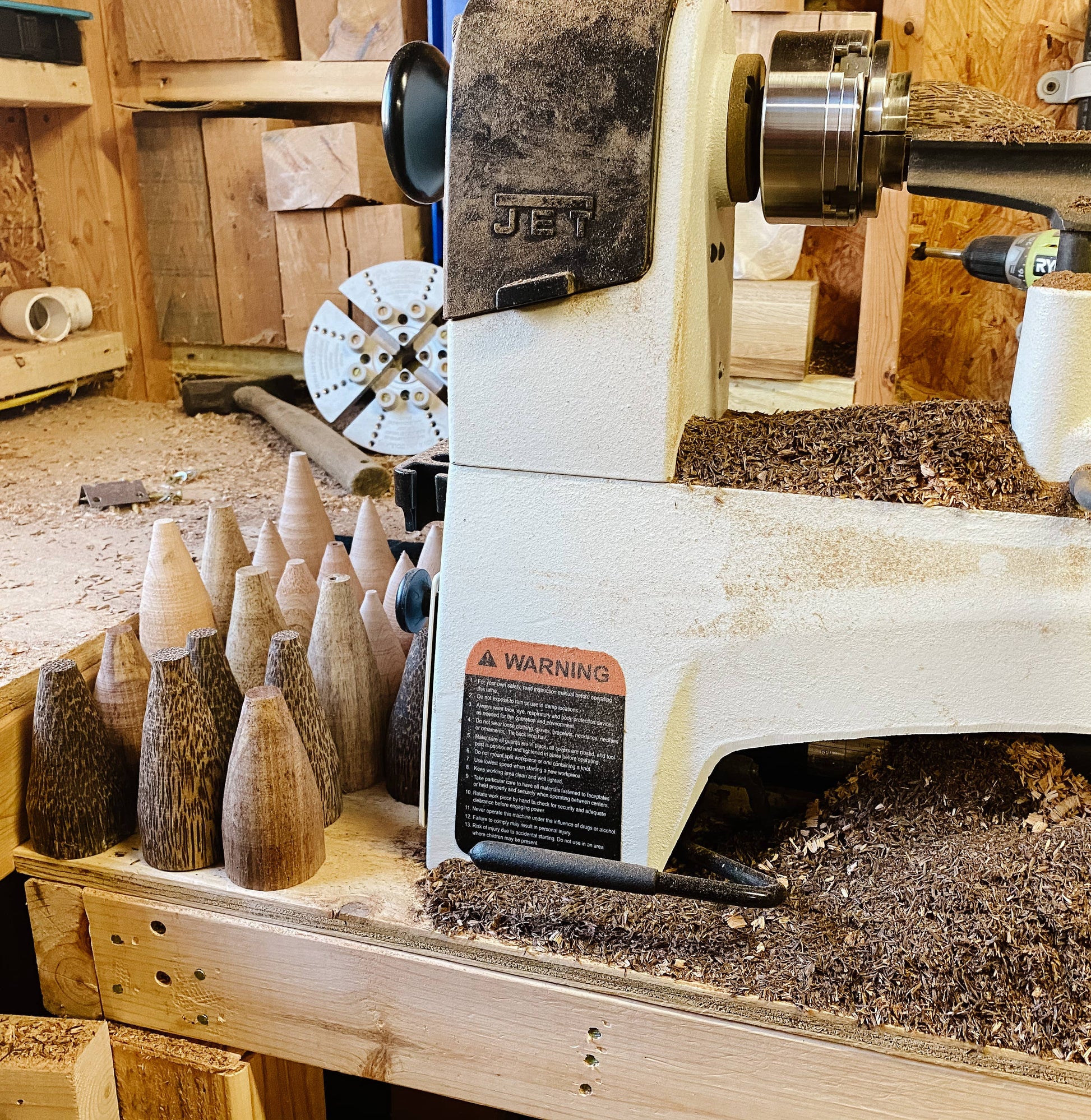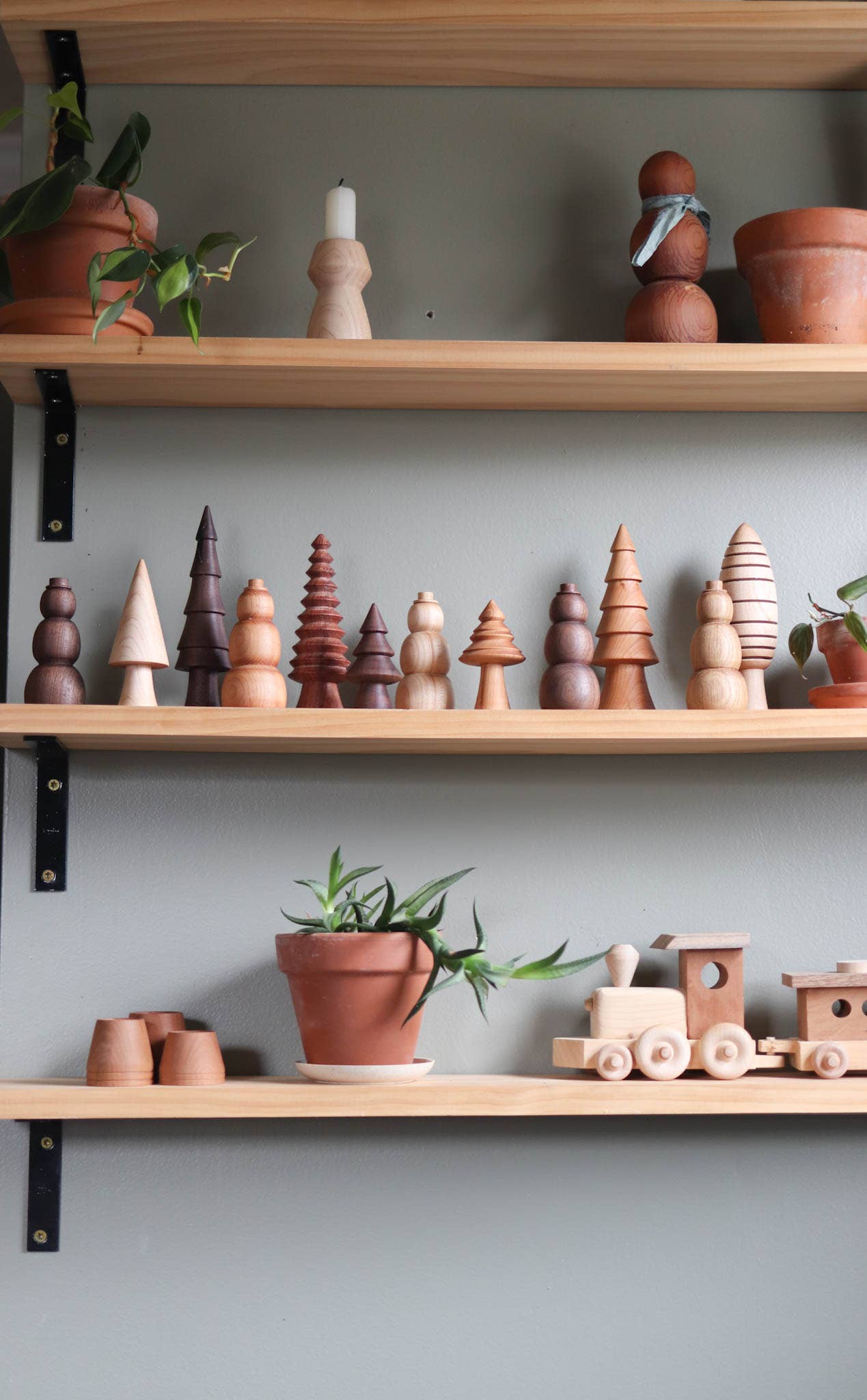 Hand-turned in small batches on our wood lathe, beautiful minimalist trees in varying heights, sizes and styles can create your very own winter wonderland forest on your mantle, table design, or bookshelf. These trees make the perfect heirloom Christmas decor that will last for generations. They are each carved from a variety of responsibly-sourced native and exotic hardwoods such as maple, walnut, bubinga, and cherry.