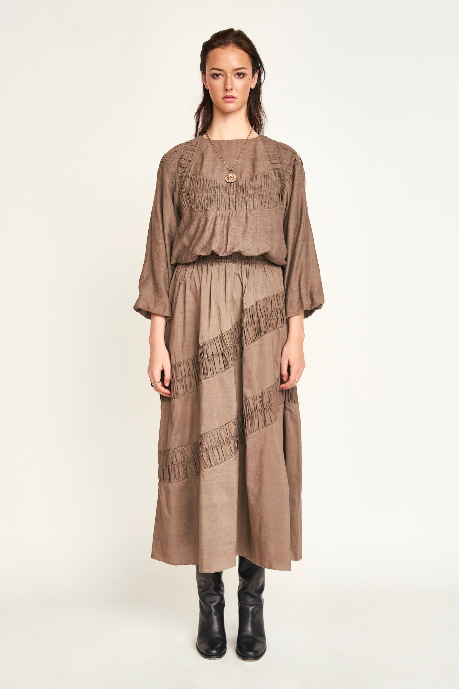 • Long sleeve silk bubble top with ruched panels across bust, back and raglan